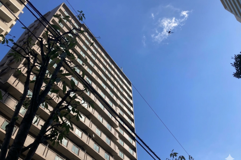 先日、ドローンを使用した外壁タイル調査を行いました。