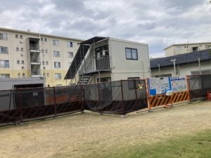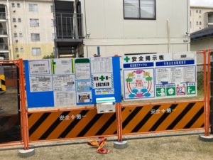 この日は、工事の本格的なスタートに先立ち、仮設事務所の設営と安全看板の設置を行いました。