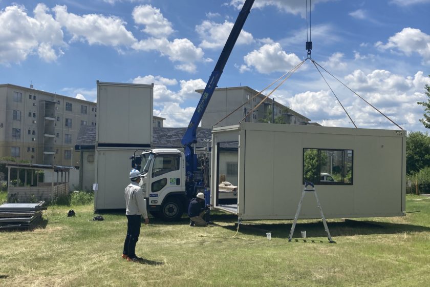 この日は、工事の本格的なスタートに先立ち、仮設事務所の設営と安全看板の設置を行いました。